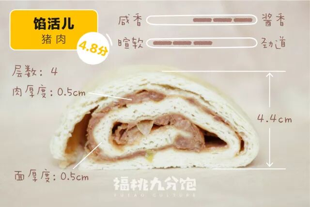 测评的时候饱妹现吃了一个,另一个放了一天加热又食用的,面完全不散,微波炉叮完面的外表都还是非常暄软,馅比较松软,肉馅拿六月鲜豆瓣酱调制的,有明显的豆瓣香气,微微发甜,整体口味偏淡,完全可以空口吃。