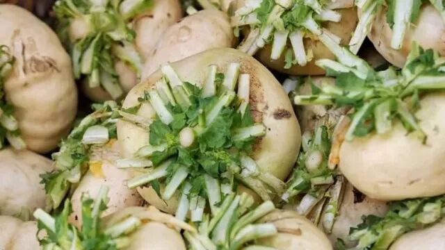 冬天来,你还会看见温州独有的盘菜。盘菜是盘菜,不是萝卜,它绵软甘甜不似萝卜辛辣清脆,除了炒腊肉,另一种吃法是盘菜生,切片白煮,蘸虾酱,这吃法温州人懂的。
