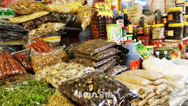 一进门,走入左边的通道,两边都是米粉、花雕料酒、虾干鱼鲞鳗鲞、红糖姜粉、年糕……还有从未见过的蟹生、鱼生、泥螺罐头。