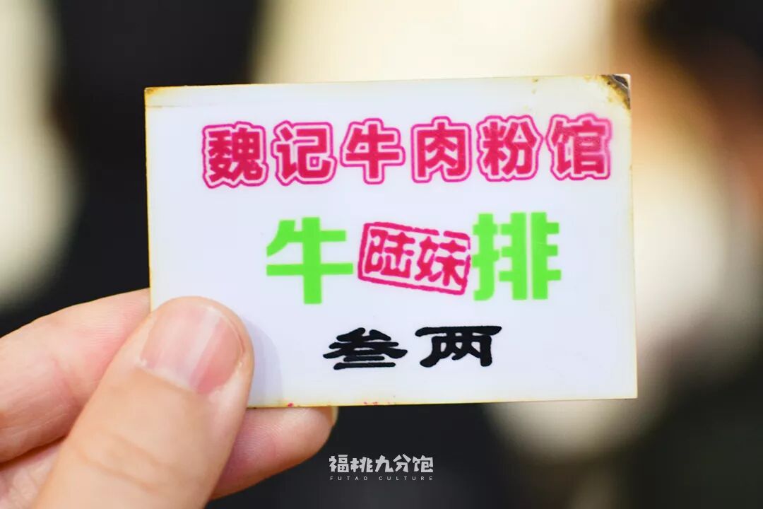 店里的头牌当属价格最贵(15元)的牛排粉。要知道魏记粉馆行走江湖三十多年,就是以它奠定地位。我迫不及待地从收银阿姨手中接过票,径直走到里头的档口排队端粉。橱窗边整齐码放着土钵,里面盛放着已经烫好的米粉。把票递进去,里头的阿姨当即拿过一碗光头粉,手脚麻利地浇上油汤和码子。