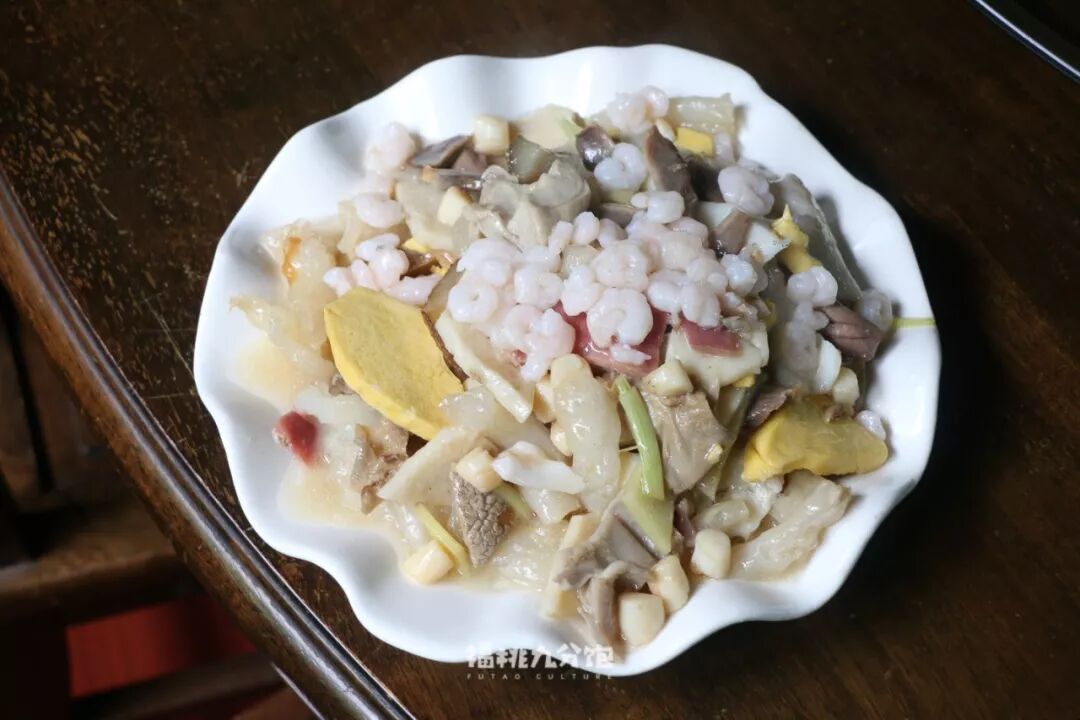 将鱼肚、鲜贝、虾仁、蹄筋和鸡片一起炒,风味增长和流失都是按秒计算的白什盘;