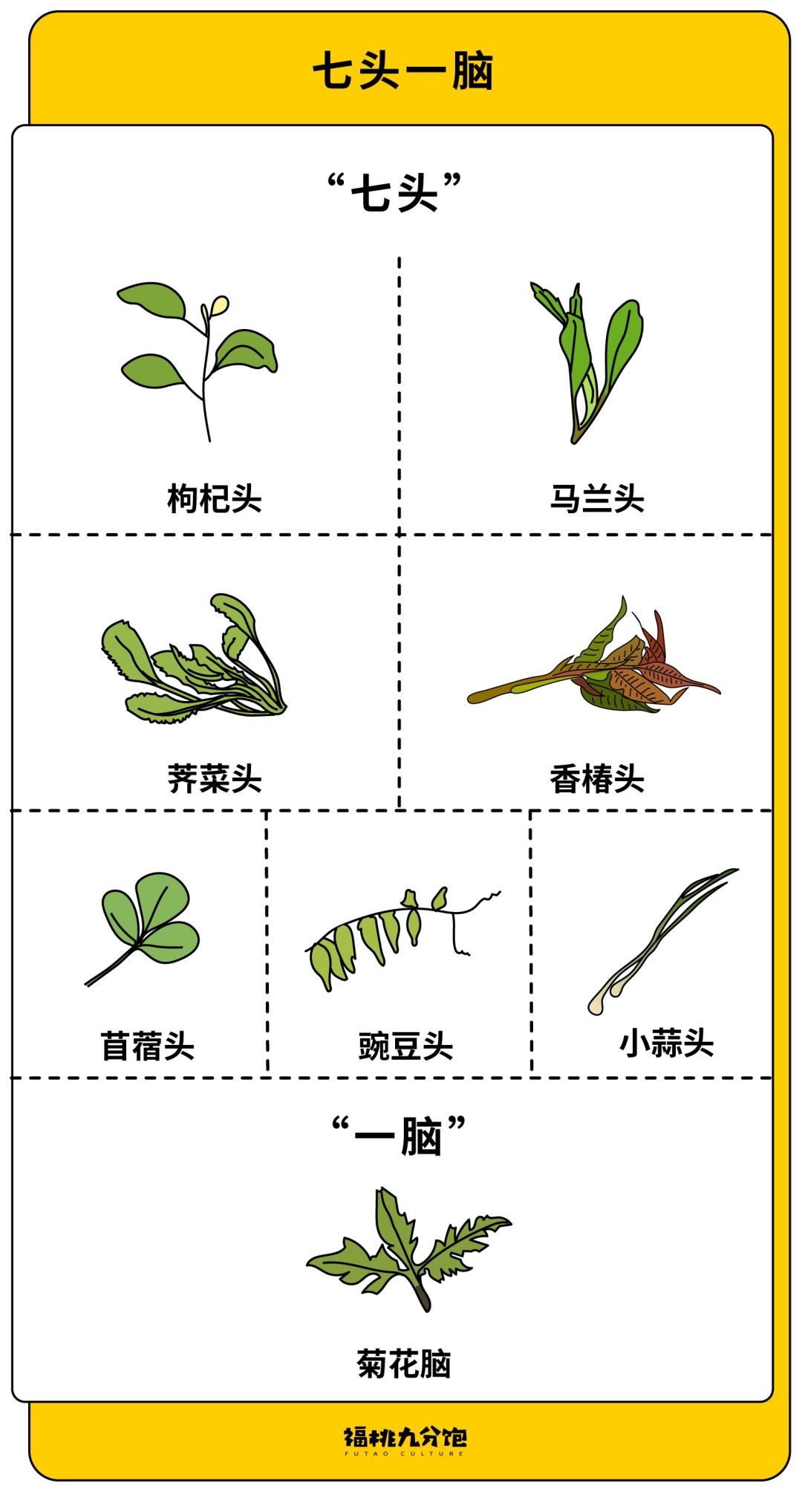 这种习惯保持到现在,就形成了一个及其丰富的时令体系——说到蔬菜,春天吃“七头一脑”。