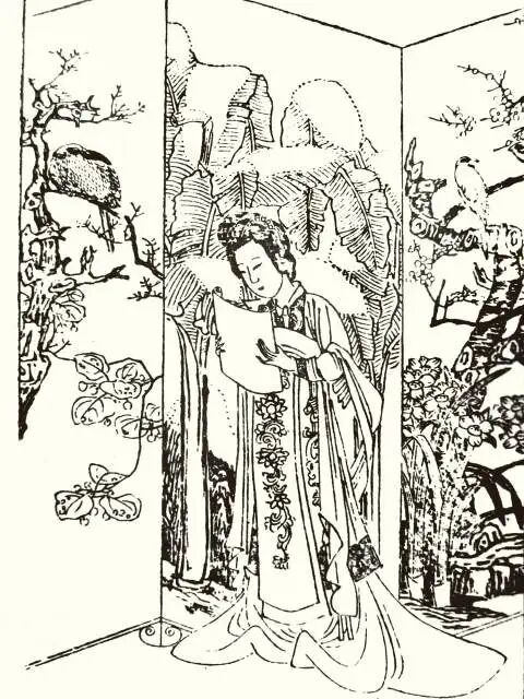 ▲图为明代徽州版画《西厢记》。莺莺正在阅读张生的情信。供图/微图