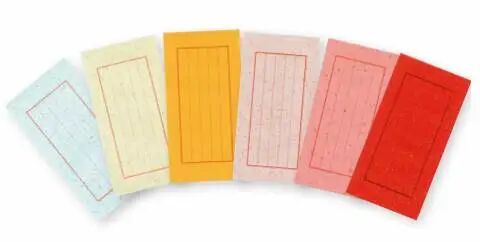 历史上还有著名的“十色笺”,主流看法称,此笺唐代已出现,由北宋时期的谢景初改进,颜色有深红、粉红、杏红、明黄、深青、浅青、浅绿、深绿、铜绿、浅云十种颜色。“十色笺”与“薛涛笺”同样出自四川,足见蜀地纸业之繁华。笺纸样式琳琅满目,数目繁多,即使普通款式,也有纹饰,单印有八条红线,称为“红八行”。