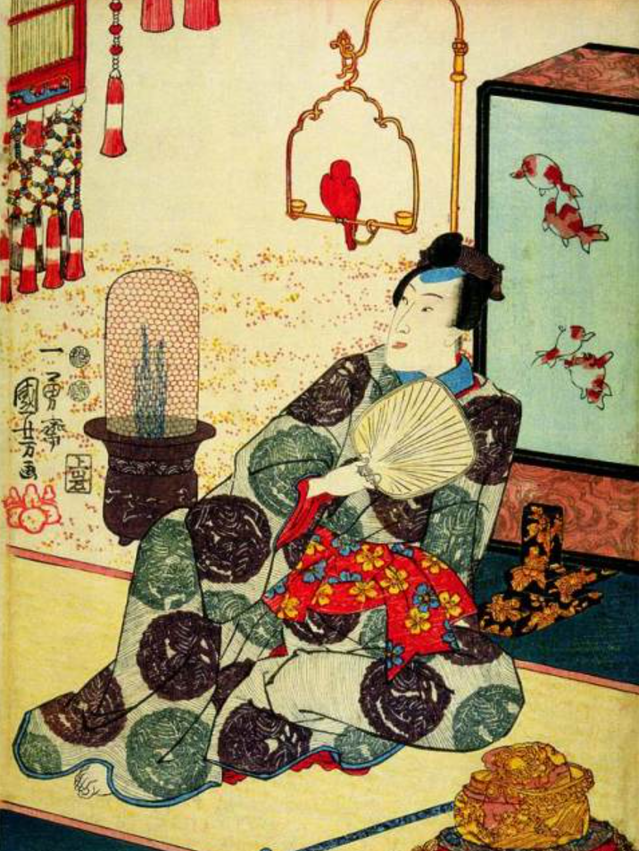 在这幅日本19世纪的仿古画作中,一位花花公子正在房间中享受他的闲雅生活。屋中有雅致的摆件、挂件,吊着明丽的红鹦鹉,背后则是一缸游动的金鱼。当中国金鱼传入日本,日本人就将这种美丽的鱼儿作为最有文化的观赏鱼之一。供图/Utagawa kuniyoshi/c