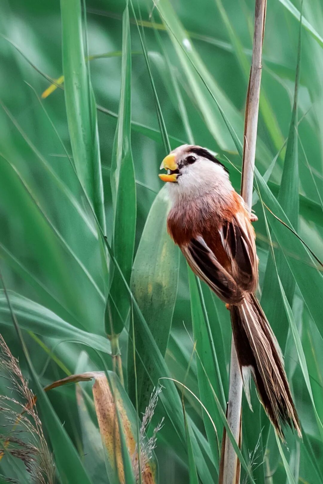 因为环境的优越,还吸引了“鸟类熊猫”——震旦鸦雀的眷顾,到此结群活动。2018年2月,盐城师范学院的崔军老师及其团队在九龙口国家湿地公园首次记录到震旦鸦雀结群出现。这是一种中国特有鸟类,属国家一级保护动物。它们体型娇小、活泼好动,靠取食芦苇中的虫子为生,终生离不开芦苇沼泽地。震旦鸦雀数量稀少,对水质和环境要求极高,是全球性濒危鸟类,但对九龙口人来说,这种小巧的鸟类却是自幼熟悉的伙伴。在灰白芦花中,震旦鸦雀时常可见,它们穿梭、跳跃,随风而动,嘴里不时发出短促的“唧唧”声,仿佛在呼朋引伴。当地人亲切地称其为“柴雀”,却不知九龙口竟默默照护着如此珍贵的精灵。