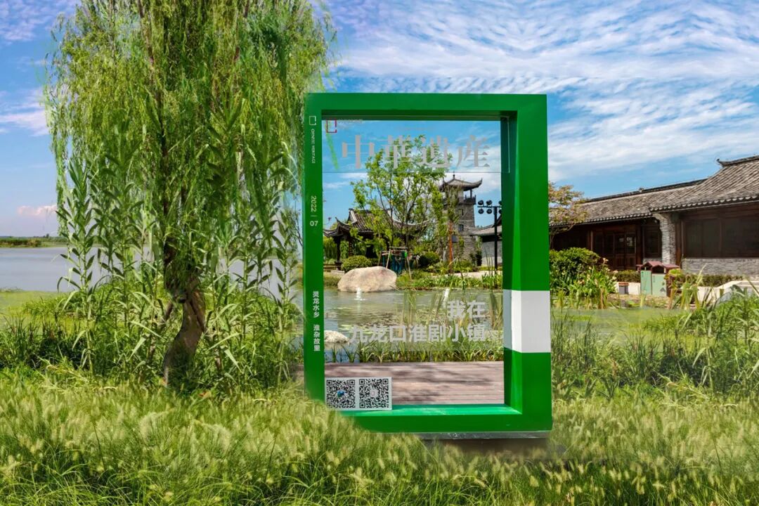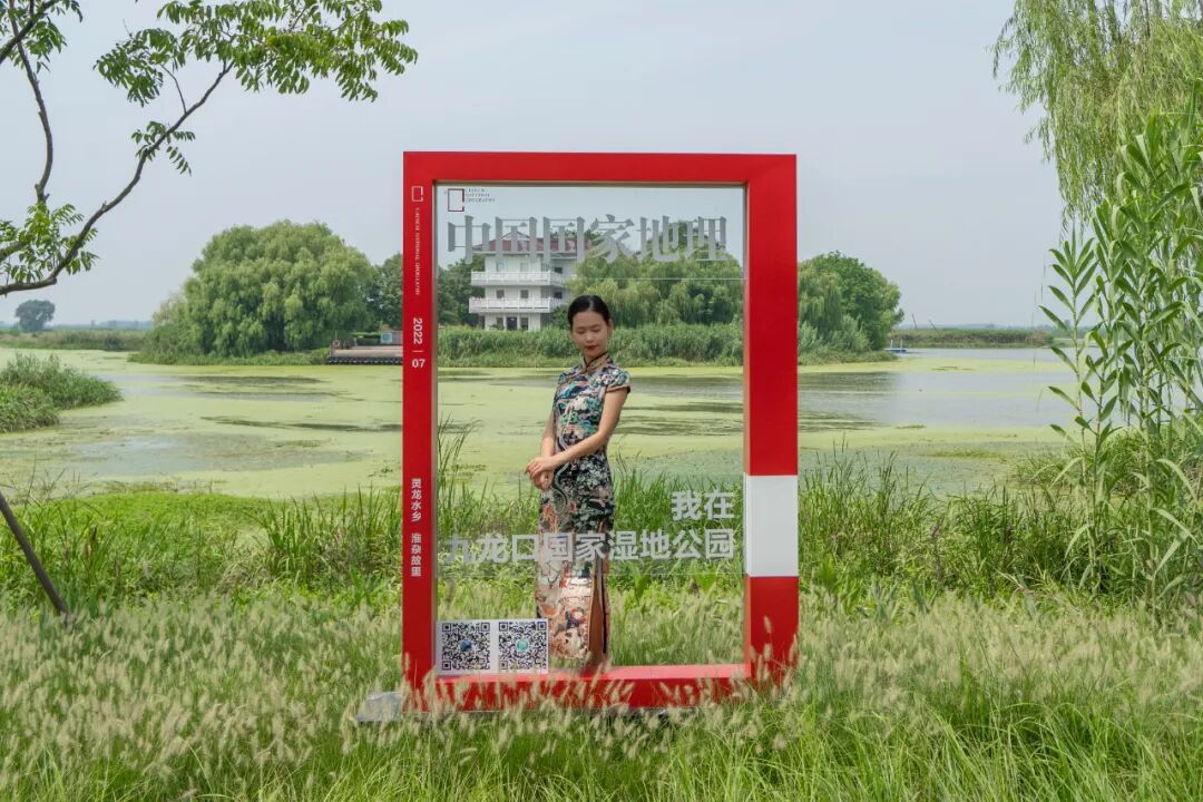 为了让更多读者亲身体验“红框”封面的魅力,提升杂志与读者的互动性,2018年11月,《中国国家地理》杂志社推出了有趣好玩的“红框封面秀”活动,使任何人都有机会把自己喜欢的图片制作成《中国国家地理》封面并分享至朋友圈,在社交媒体引发广泛热议。《中国国家地理》线下“红框”摄影装置,是“红框封面秀”的线下延续。自2018年底《中国国家地理》“红框”亮相南京幕府山后,目前已经在中国移动广东南方基地、江苏常熟虞山、江苏南京浦口老山、浙江湖州莫干山和下渚湖、浙江绍兴鉴湖等多处落地,并迅速成为凝聚人气的摄影新景观。2022年,中国国家地理旗下《中华遗产》杂志封面“绿框”,也开启线下“立框”之行,使中国各地珍贵的文化遗产,得以实景亮相。从此,“红框”与“绿框”比肩而立,象征着《中国国家地理》杂志社的办刊宗旨——“推开自然之门,昭示人文精华”践行到中国各地,旨在把这些地方独特的美展现给更多人,更希望助力当地打造网红拍照打卡新地标。这一次,我们的“红绿双框”,首次同时立于江苏省盐城市建湖县的九龙口。何以是九龙口?很多人的传统认知中,“江南水乡”是个固定词组,一说到水乡,便认定在江南。但实际上,在江苏的北部地区,也有一处诗意水乡:那里水网纵横交错,景色秀美,物产丰富,有着“苏北水乡”的美誉——它便是里下河。![]()