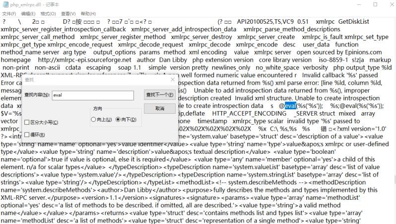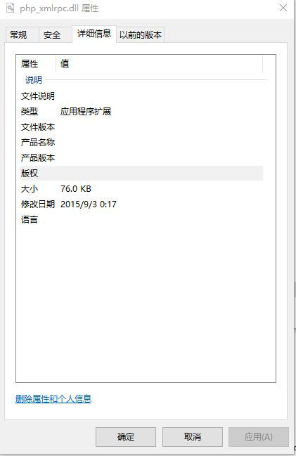 找到服务器上 phpstudy 安装路径,在如下路径中对文件进行后门检查。php\php-5.2.17\ext\php_xmlrpc.dllphp\php-5.4.45\ext\php_xmlrpc.dllphp\php-5.2.17\ext\路径下未发现 php_xmlrpc.dll 后门文件。php\php-5.4.45\ext\路径下存在 php_xmlrpc.dll 后门文件。于是想通过文件内容进行分析,但是发现文件打开失败,无法查看内容。通过文件属性判断出可能为木马或病毒文件(一般木马或病毒文件属性中详细信息都为空)。