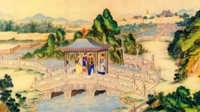 《红楼梦》元妃省亲一段,众人为大观园桥上的亭子命名。