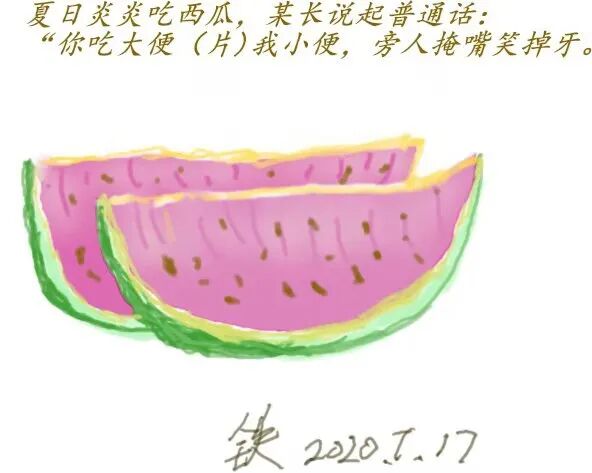 夏天里,西瓜多汁解渴又好吃。难怪早些年有位平易近人的市长大人带着下属到郊区视察,渴了就到路边卖西瓜的摊档买几个西瓜切块请大家吃。他用不大准的普通话招呼大家:“你吃大便我吃小便”。虽然他普通话说不准,把“片”说成“便”了,但大家能在大热天里吃西瓜解渴又去暑很高兴呢!只不过那撇脚的普通话成为广州人友好的笑话了。例如他和下属坐船到郊区水乡视察,他说:“坐在床头(船头)看娇妻(郊区),越看越喜欢”。那笑话多了去了。但是他不会计较,所以说“友好”。大概这也是平易近人的标志啦!![]()
