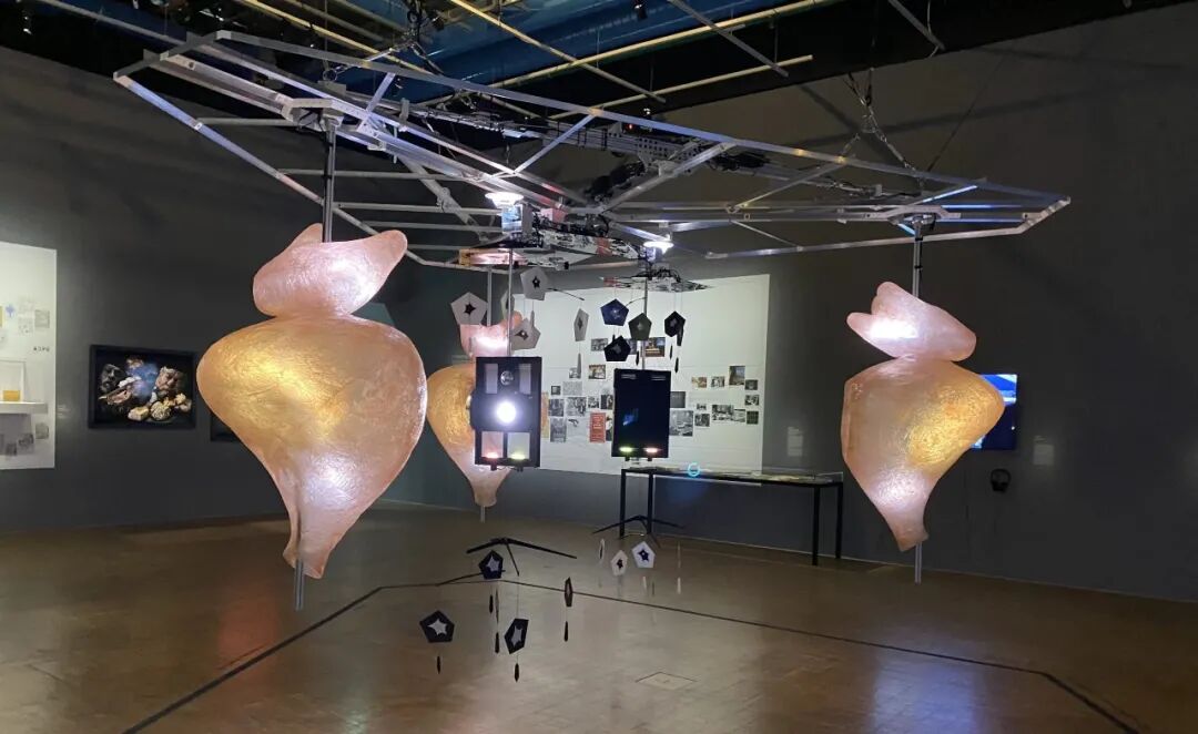 《控制论光塔》(Cybernetic light tower)另一个展品《运动的对话》(The Colloquy of Mobiles)是最符合展览主题的作品,它的创作者是英国控制论学家戈登·帕斯克。这是五个分成两组悬挂在天花板上的可旋转装置,其中一组是两个安装了发光器和感光元件的悬挂物,被称为“雄性(male)”;另一组是三个被曲线形态的反光玻璃纤维包裹的物体,被称为“雌性(female)”。“雄性”旋转并发出光线寻找“雌性”,当后者接收到光线后会反射给前者,并用一种同步的识别声音回应前者,随后两者完成配对。但是两个“雄性”会彼此竞争,打断对方和“雌性”的配对。观众也可以通过阻挡或反射光线加入这场配对游戏。![]()