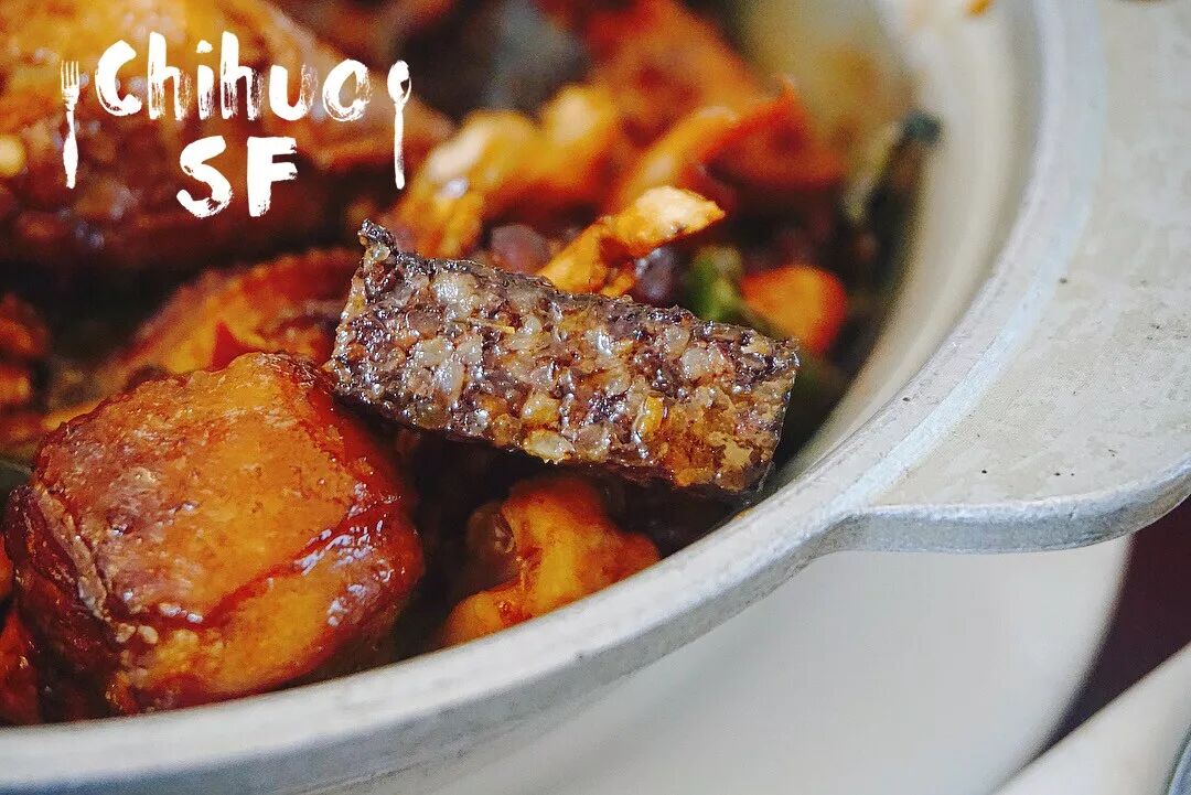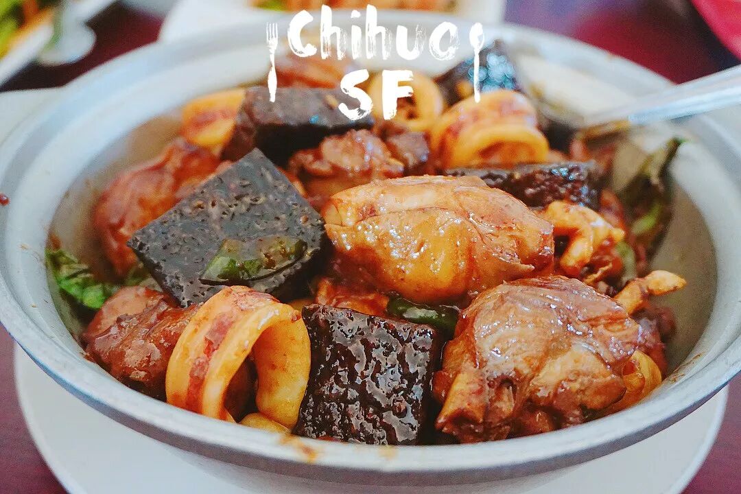 这道菜的精髓竟然是鱿鱼!有种烤鱼的口感,筋道弹牙又充满滋味……还是很有私心地给了猪血糕一个特写,猪血糕是用真的猪血加入糯米蒸熟成糕状,比糯米糕更硬一些,很有嚼劲。讲真这道菜三个食材都好吃,强烈推荐哦~
