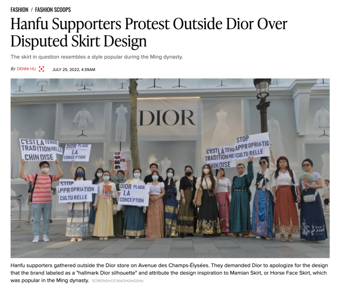 迪奥的2022年5月发布了一系列成衣作品,其中一款黑色百褶半身长裙,被指出文化挪用了中国传统服饰马面裙。