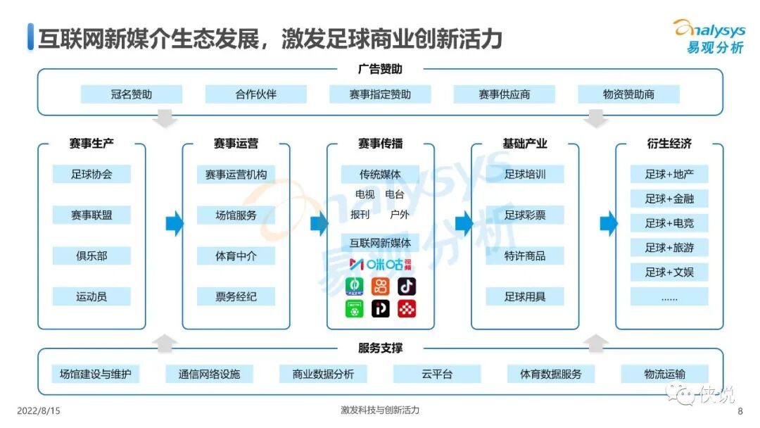 足球产业作为体育产业的重要细分领域之一,在市场经济的催化下快速成长,以赛事为出发点创造了超高的经济价值,并在市场环境下持续优化产业结构,继续增长动能。