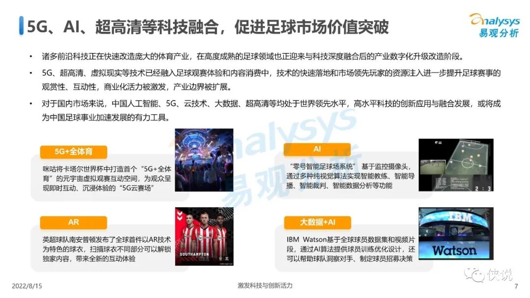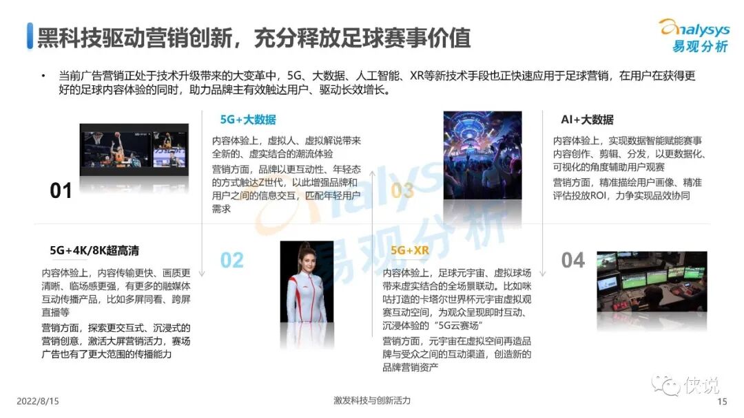 5G、超高清、虚拟现实等技术不仅融入足球观赛体验和内容消费中,也正快速应用于足球营销,在用户在获得更好的足球内容体验的同时,助力品牌主有效触达用户、驱动长效增长。