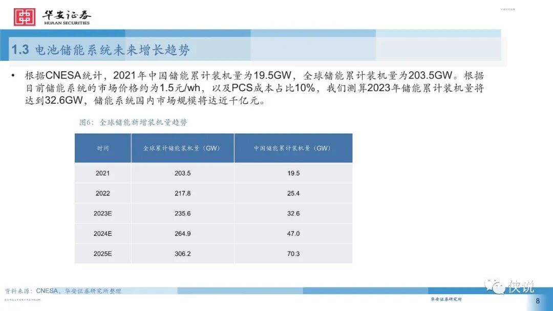 我们根据行业储能系统报价推算储能系统中,成本占比情况,电池占比约60%,储能变流器PCS占比约20%,温控系统占比约5%,储能消防系统和能量管理系统各占比2%左右。