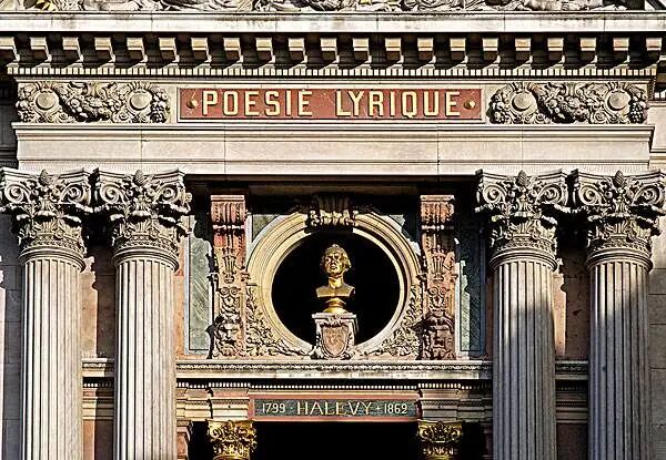 巴黎歌剧院建筑外立面采用了古典建筑中惯用的上、中、下三段式,每一段都运用了不同的建筑要素。