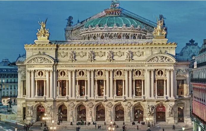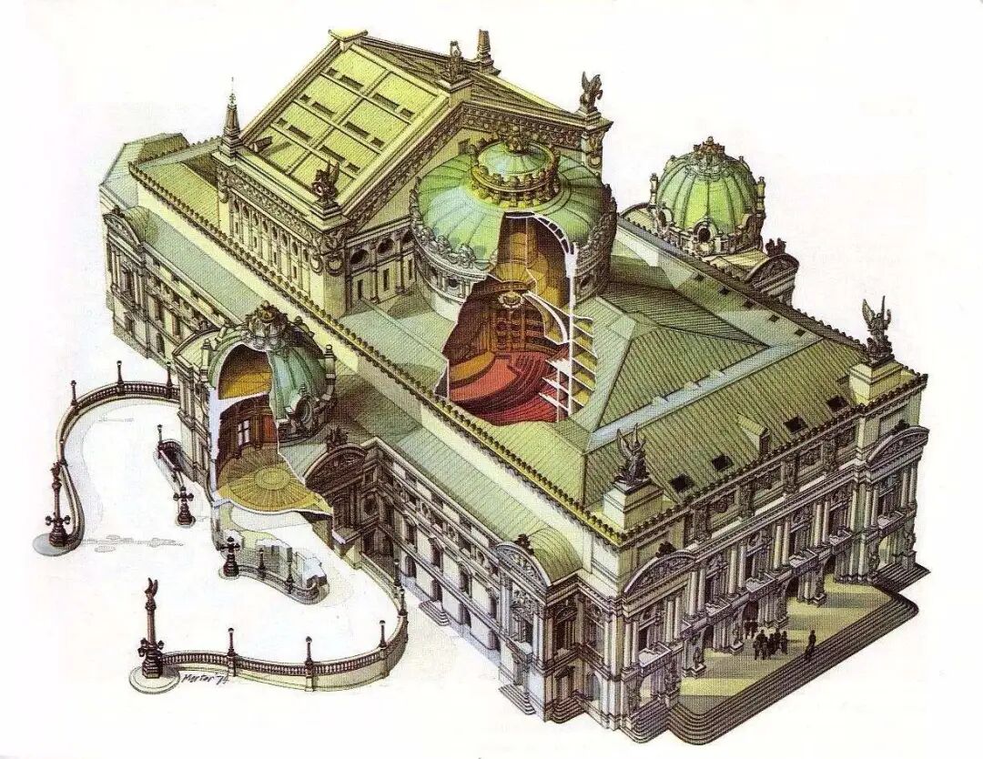 巴黎歌剧院是由建筑师查尔斯·加尼叶(Charles Garnier)于1861年设计的,是折衷主义代表作,其建筑将古希腊罗马式柱廊、巴洛克等几种建筑形式完美地结合在一起,规模宏大,精美细致,金碧辉煌。