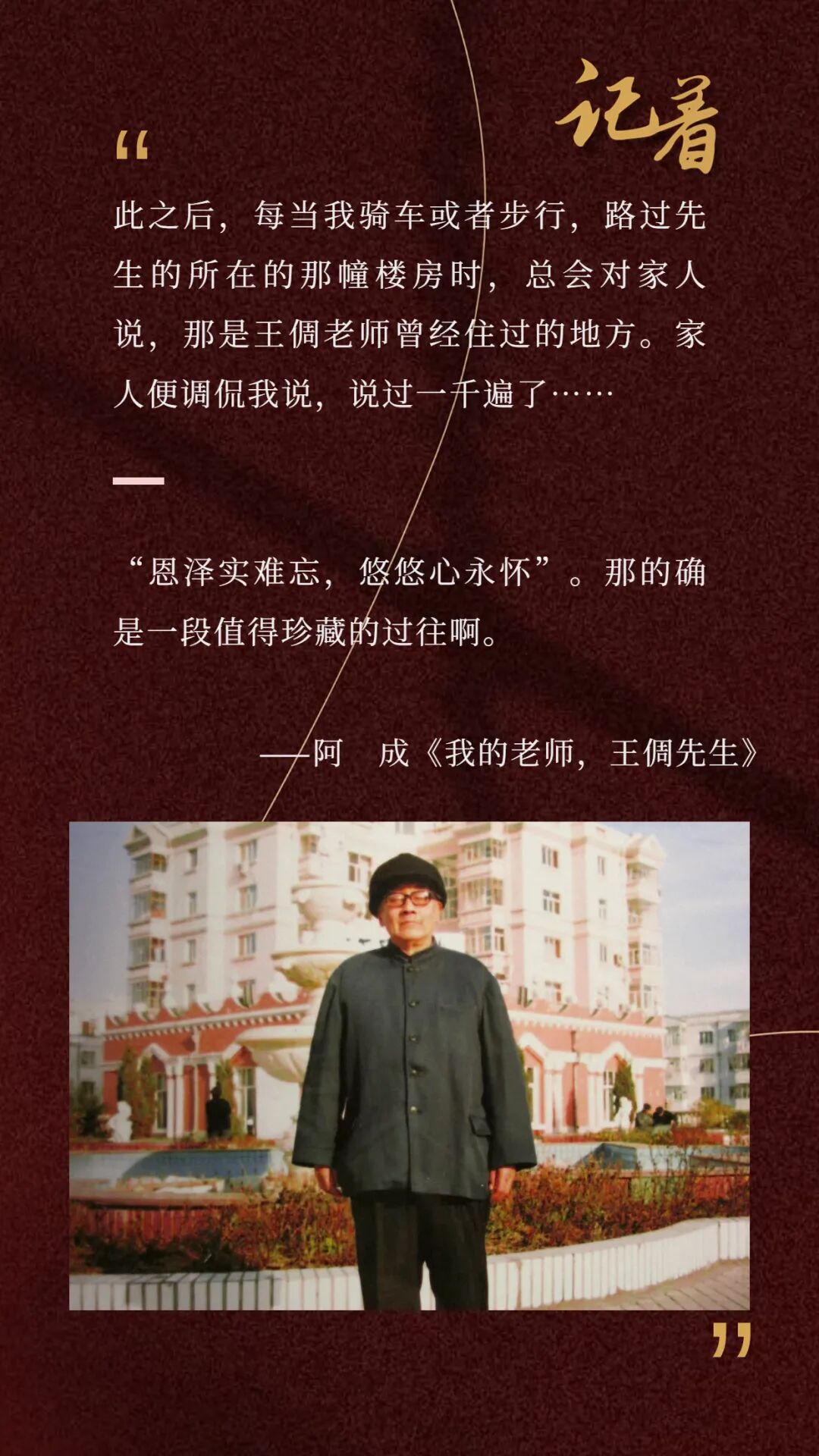 此之后,每当我骑车或者步行,路过先生的所在的那幢楼房时,总会对家人说,那是王倜老师曾经住过的地方。家人便调侃我说,说过一千遍了……