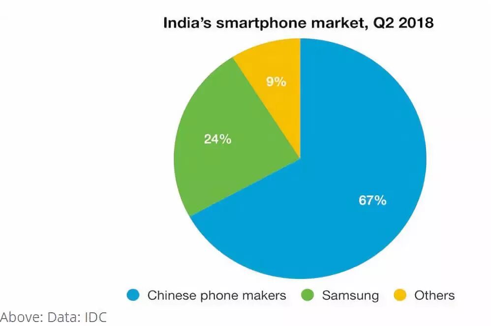 2018年7月,IDC发布的报告显示出国产手机在印度可怕的“抢占市场”的能力。数据显示,三年之前,全部的中国智能手机制造商不过占据了区区15%的市场份额。然而,“三十年河东,三十年河西”,中国的“智能手机军团”仅仅用了十分之一的时间,在短短三年内就霸占了印度三分之二的市场,可谓“火箭速度”。