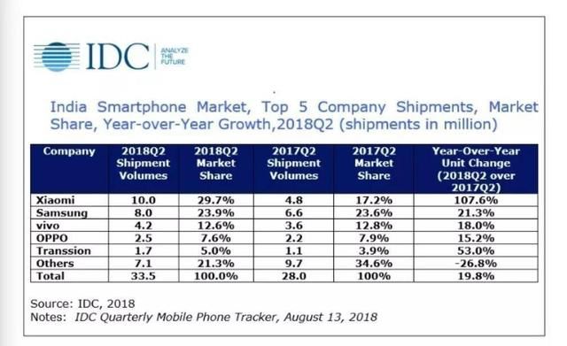 在印度市场充当领头羊的国产手机厂商是小米。2017年,小米公司终结了韩国三星公司五年作为印度最大手机销售商的历史。当年的第三季度,小米凭借920万台手机出货量,占据印度23.5%的智能手机市场份额,将三星甩开一大截,至今仍稳居印度第一大手机品牌宝座。时至今日,IDC的数据显示,2018年第二季度,小米已经连续第四个季度成为印度最大的手机供应商,牢牢占据头把交椅。