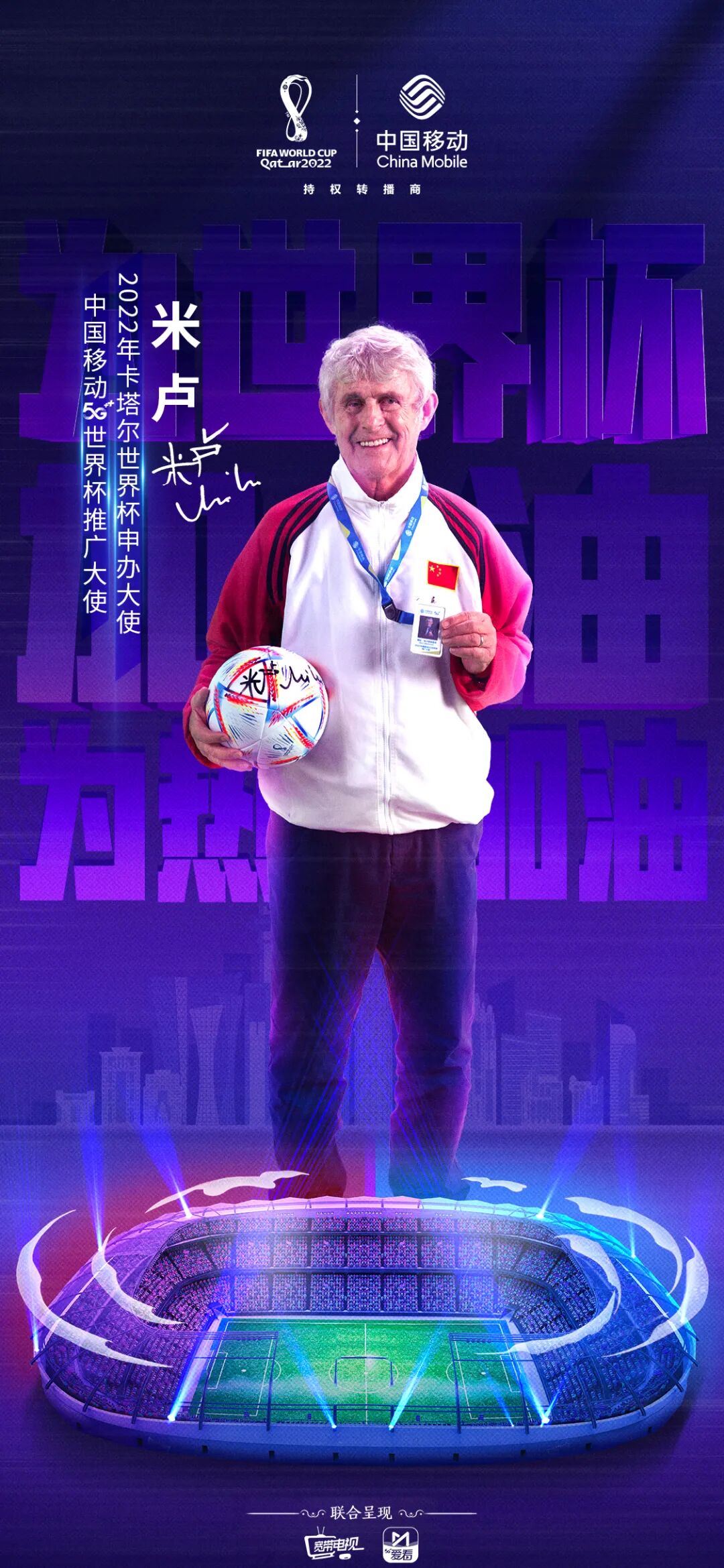 当日,中国移动正式官宣“足坛神奇教练”博拉·米卢蒂诺维奇为中国移动5G世界杯推广大使。20年前,他曾带领中国国家男子足球队首次打进世界杯,给无数球迷留下难忘回忆。如今身为卡塔尔世界杯申办大使、中国移动5G世界杯推广大使,米卢表示将继续为足球贡献自己的热爱,并号召众人一起在咪咕视频体验世界杯“元宇宙”,传递足球热情。