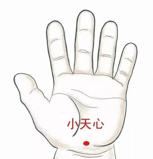 右手握拳状,中指弯曲顶出,其余四指将中指固定,用中指关节捣左手小天心,共50次。小天心位于掌根,大鱼际与小鱼际交接凹陷处。捣小天心可清热止咳,散郁安神。