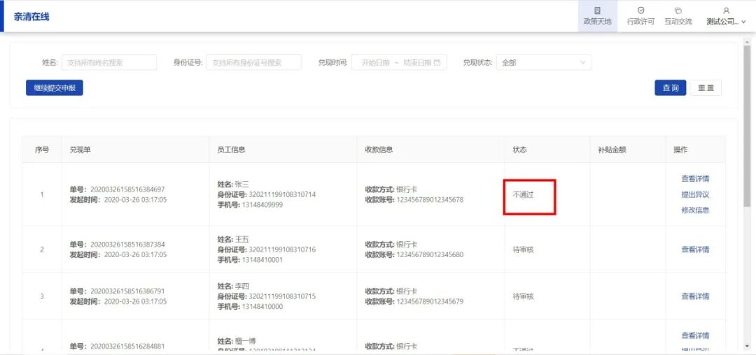 提交后进行系统校验,校验后的名单分为“通过”和“不通过”两种状态:
