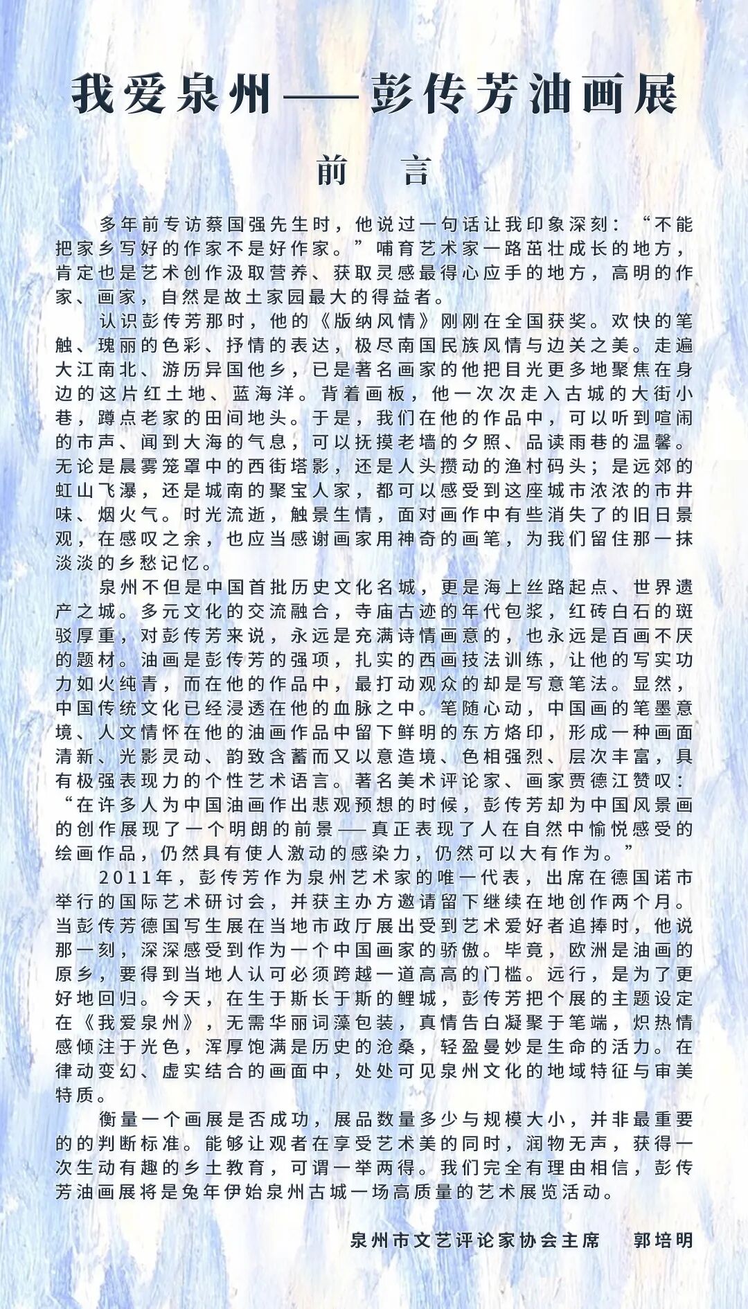 展览内容:著名油画大师彭传芳个人油画展,在律动变幻、虚实结合的油画作品中,感受其作为泉州本土人笔触下对故土的理解与感悟,处处可见泉州文化的地域特征与审美特质。