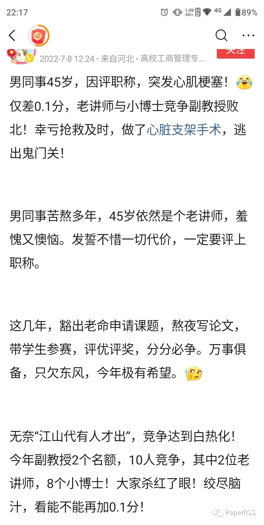 最近,有任职高校的网友发文称:同事45岁的老讲师晋升副教授,差0.1分再次落选,突发心梗。幸亏抢救及时,做了心脏支架手术,逃出鬼门关!