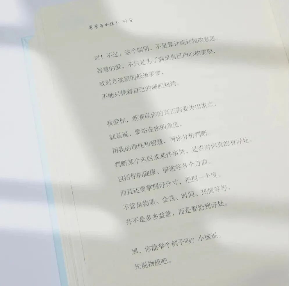 这样的父亲越来越多,类似49中这样的悲剧,一定会越来越少,幸福的孩子和家庭也会越来越多。上面这些图片,拍摄自赵洪云的《爸爸与小孩》一书。作者赵洪云正是这样的一个“平凡而伟大”的父亲,却做了一件了不起的事——把一个父亲十多年的艰难试错史,所有踩过的坑,一个个记录了下来。 ——他做好了一件看似极其简单,却很少有父亲能做到的事,和孩子在人生的真正问题上,展开对话。——他用了十多年时间,做孩子的真正的朋友,去抹平两代人之间的代沟。——他小心翼翼的应对着孩子一个个稚嫩的问题,脆弱的好奇心,将自己人生经验和信念,润物细无声的传递。 在这个快节奏的浮躁社会,向每一个“平凡而伟大”的家庭诚挚推荐《爸爸与小孩》这本书。它纠正了一个绝大多数家长都弄错的顺序——总是急于成才,却没有意识到,一个孩子能否成才,先取决于灵魂能否“成型”。 真正的教育,需要的是最简单的常识,是一本当孩子遇到问题,翻开来就能找到答案的手边工具书。而本书,可以为家长做减法,为孩子做加法,让父亲先幸福起来,向孩子传递幸福,并在幸福中传递卓越和健全的人生力量。感兴趣的朋友可扫描或长按下图中的二维码↓![]()