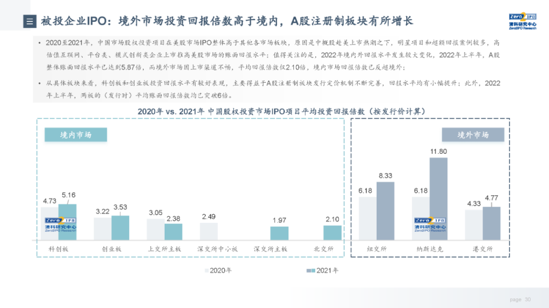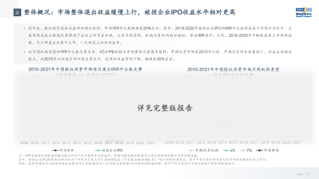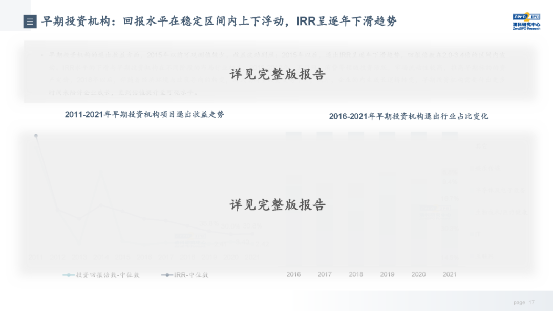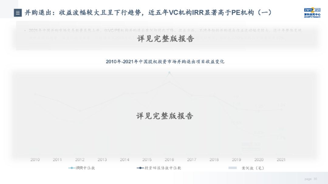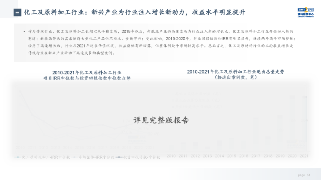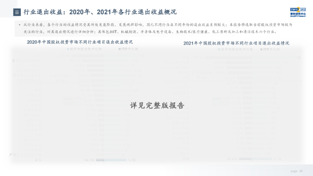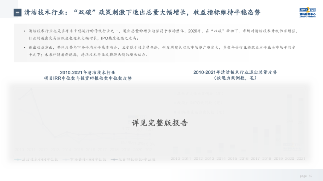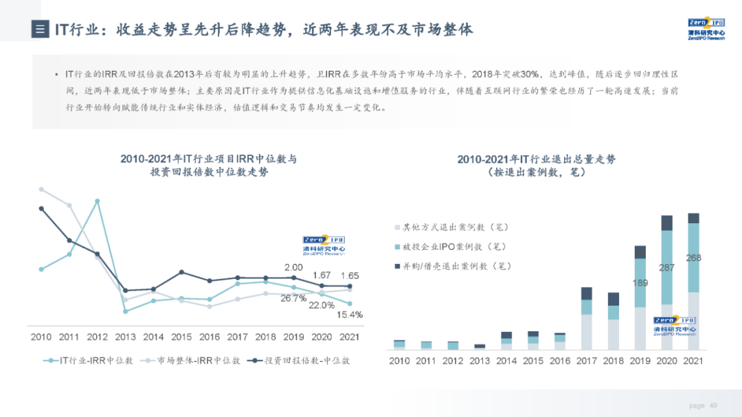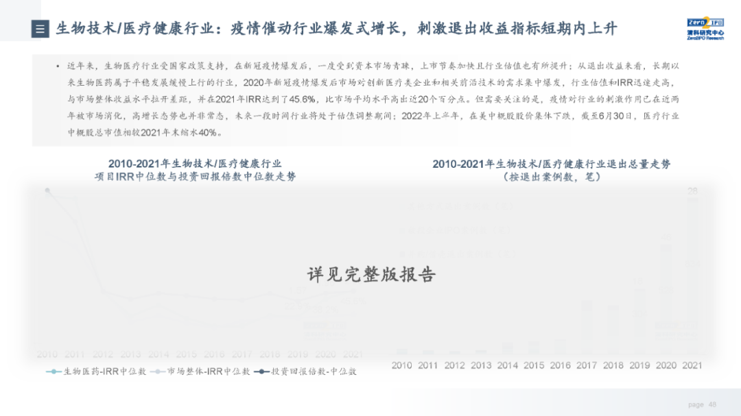 退出收益方面,市场整体退出收益缓慢上行,近4年被投企业IPO的收益水平高于市场整体,但优势正在逐步收窄。从不同机构类型来看,VC和PE机构与市场整体基本趋同,而早期投资机构近两年收益有所下降。从行业来看,各个行业的收益情况受其所处发展阶段、发展规律影响,因此不同行业在不同年份的退出收益差别较大,本报告选取目前股权投资市场较为关注的6个行业,分析其近十年的退出总量和收益走势。