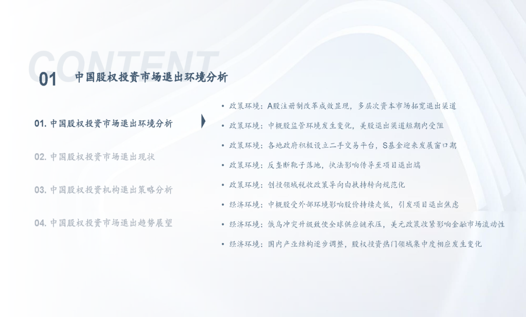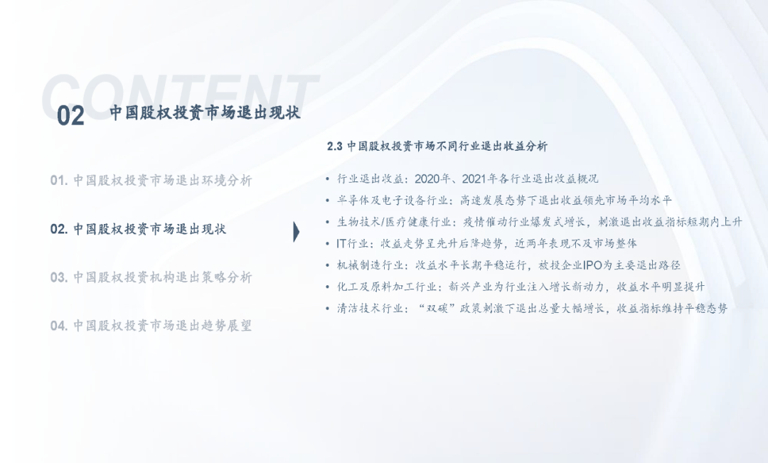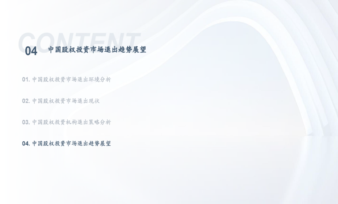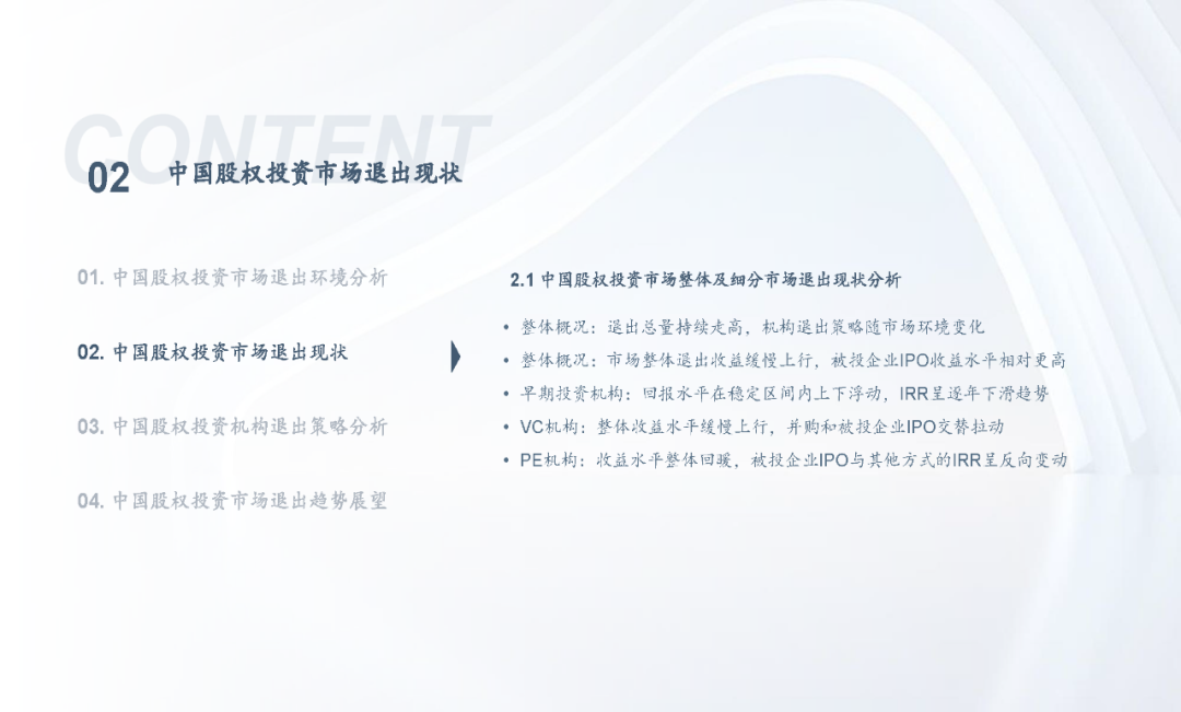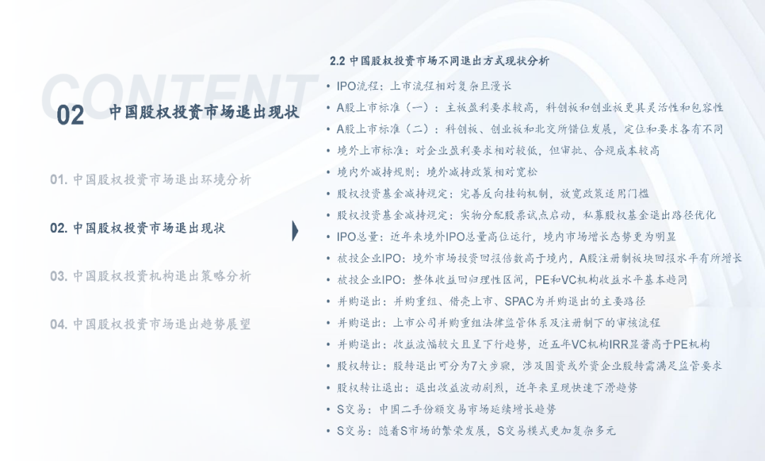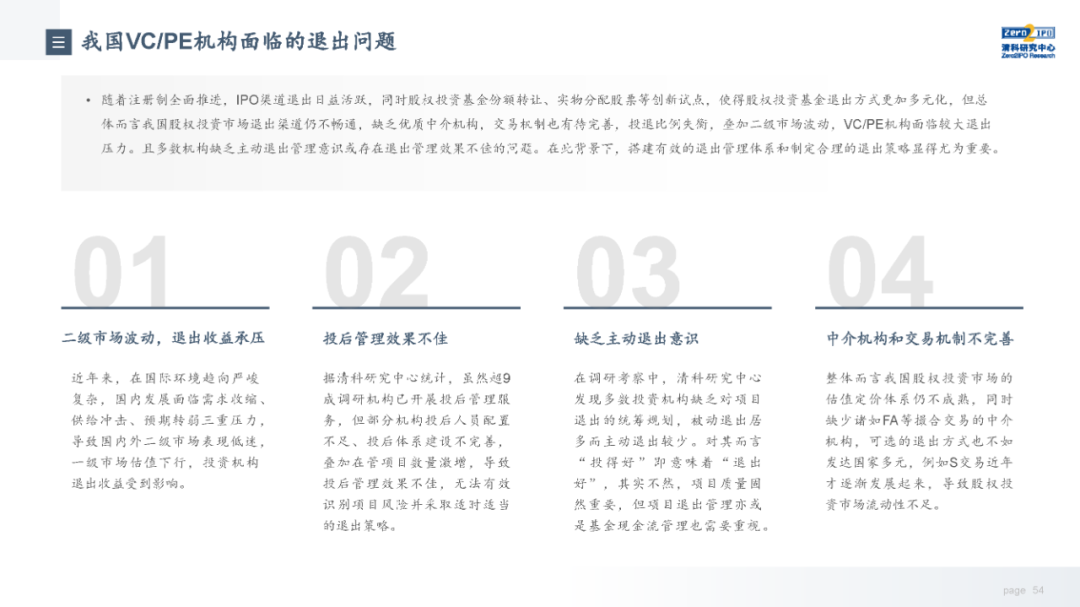 当前,随着注册制全面推进,IPO渠道退出日益活跃,叠加股权投资基金份额转让、实物分配股票等创新试点,股权投资基金退出方式更加多元化;但另一方面,退出市场仍面临一系列问题,如投退比例失衡、二级市场波动导致VC/PE机构退出承压、交易机制不完善、缺乏优质中介机构等,同时,多数机构还缺乏主动退出管理意识或退出管理效果不佳;因此,搭建有效的退出管理体系和制定合理的退出策略显得尤为重要。未来,机构和被投企业的数字化水平、税务政策、ESG考量等诸多因素都将共同影响中国股权投资行业退出市场的发展。