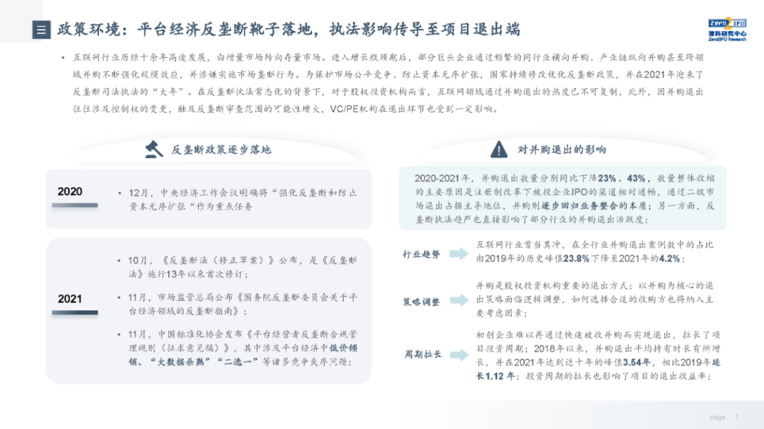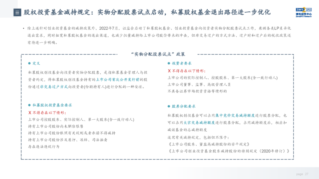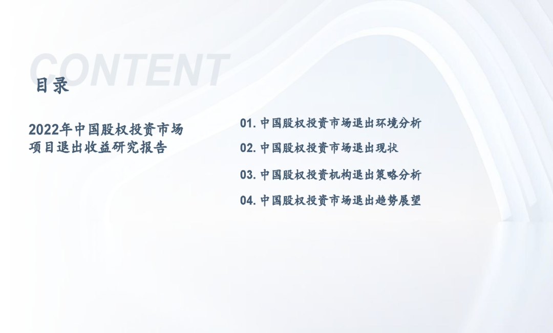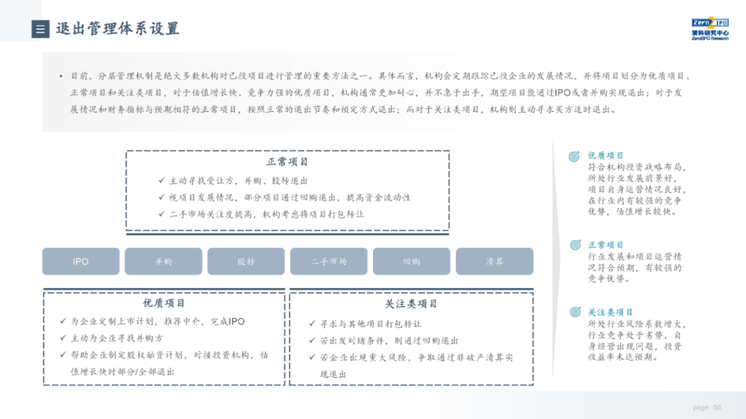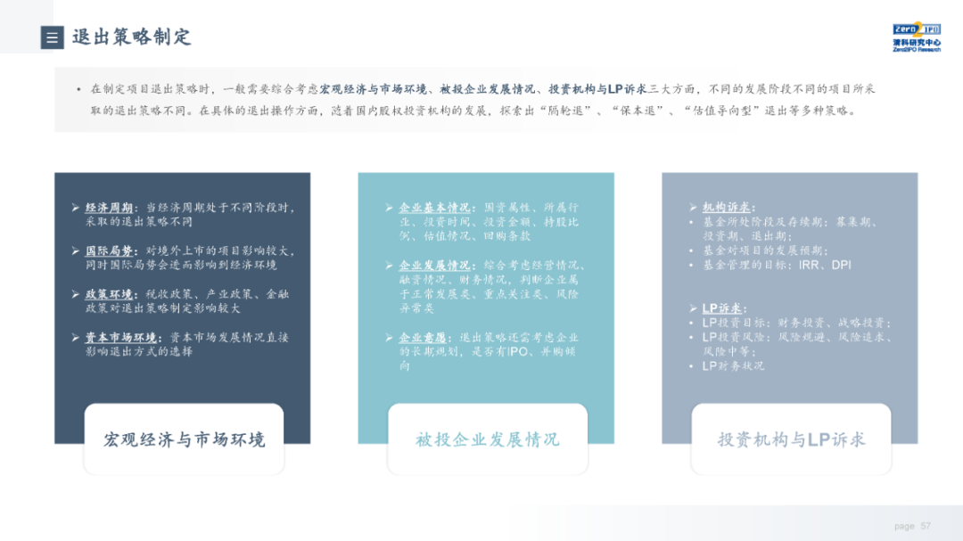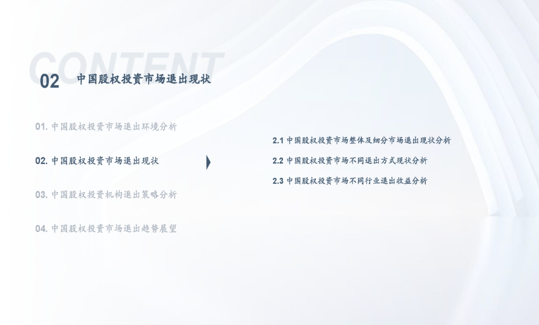 当前,随着注册制全面推进,IPO渠道退出日益活跃,叠加股权投资基金份额转让、实物分配股票等创新试点,股权投资基金退出方式更加多元化;但另一方面,退出市场仍面临一系列问题,如投退比例失衡、二级市场波动导致VC/PE机构退出承压、交易机制不完善、缺乏优质中介机构等,同时,多数机构还缺乏主动退出管理意识或退出管理效果不佳;因此,搭建有效的退出管理体系和制定合理的退出策略显得尤为重要。未来,机构和被投企业的数字化水平、税务政策、ESG考量等诸多因素都将共同影响中国股权投资行业退出市场的发展。