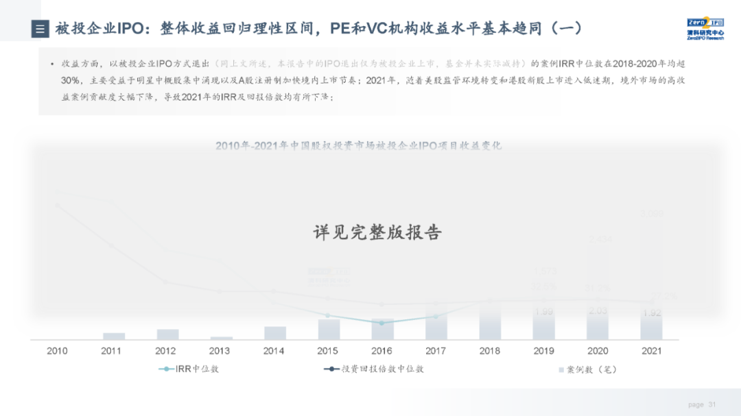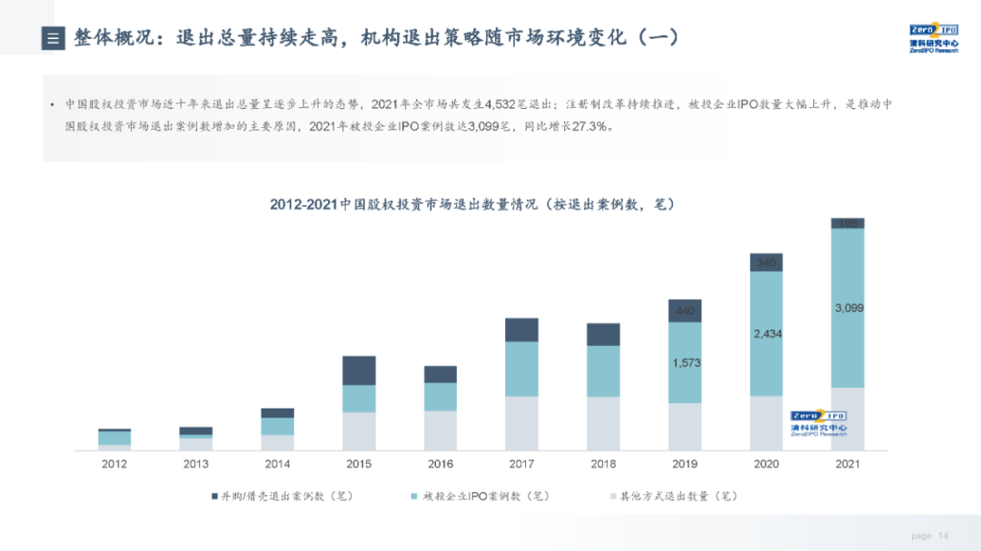 清科创业(01945.HK)旗下清科研究中心重磅发布《2022年中国股权投资市场项目退出收益研究报告》,深度探析中国股权投资市场项目退出的最新政策和经济环境、收益指标走势、退出策略以及发展趋势。数据显示,2021年,中国股权投资市场整体表现强劲,项目退出活跃度也再攀高峰,全年案例数共4,532笔,同比上升18.0%;其中,被投企业IPO占比接近七成,案例数同比上升27.3%,主要受益于国内注册制改革成效突出,A股多层次资本市场为股权投资机构项目退出提供了通畅、良好的渠道。在IPO常态化背景下,2021年通过并购和借壳退出的事件明显减少,案例数同比分别下跌37.3%和91.2%;同时,股转相对活跃,案例数同比上升26.2%,机构退出策略有所调整。