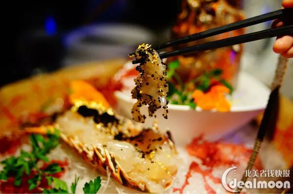 米其林指南推荐的新派高级日料,他们家有一款冰火两重天的澳洲大龙虾两吃。其中一吃,就是在龙虾刺身上撒上食用金箔和饱满的黑鱼子。
