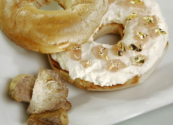 这个Bagel由当地面包房新鲜制作,加上白松露奶油和注入雷司令葡萄酒的枸杞果冻,上面缀以用金箔制作成的叶片,看起来超级可口。