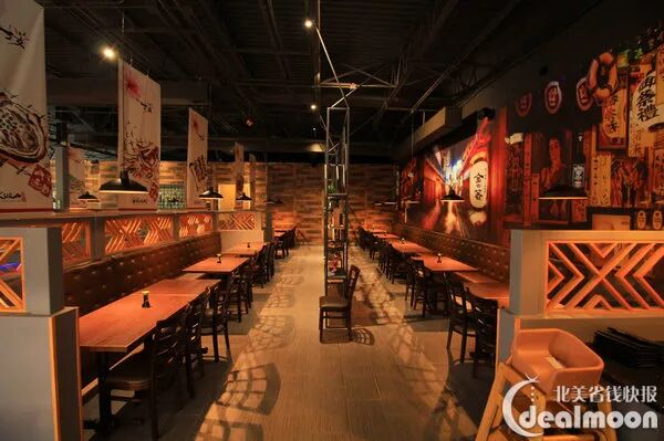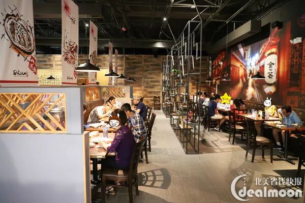 餐厅的装潢采用了日系风格,门口的日式庭院吸引了不少顾客的目光,室内设计仿造居酒屋风格, 简洁大方。