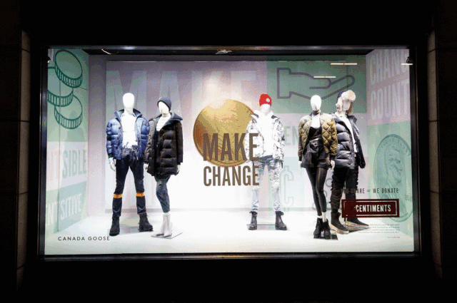 Barneys节日橱窗今年很严肃却又充满寓意,2018年的主题为“Make Change”,面向Madison Ave的两面橱窗内,用4万枚闪亮的1美分硬币组成了硕大的"Make Change"字样, 其他橱窗也已美分图案作为背景。通过硬币的概念,表达“微小的变化可以产生很大不同”,“小小善行,积少成多,也能改变世界“的想法。同时呼吁大家关注Barney所合作的美国儿童教育慈善组织Save the Children.
