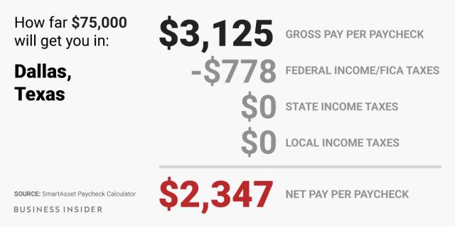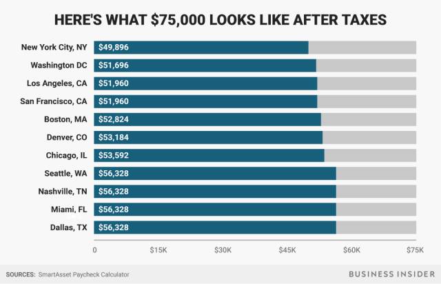 Business Insider发表了一篇文章,对比了包括洛杉矶、旧金山、纽约、华盛顿、德州达拉斯等在内的美国11大城市税收情况,看看同样是7.5万年薪,在这些城市,究竟能拿到手的有多少钱呢?