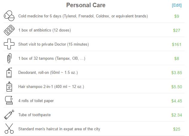假设身体不错,不常生病,个人护理的费用只有洗漱用品,卫生纸,理发等消费,平均每月约$50美金。