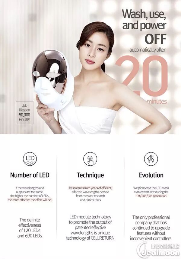 红光可改善皮肤暗沉,色斑,皱纹,弹性和红潮,有去皱,美白,增加弹性的功能,Cell Return特有的近红外线波长,可以最大程度地促进骨胶原再生;
