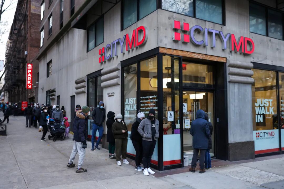 19日,像在曼哈顿上西区的一所市属诊所CityMD前,需要进行新冠感染检测的民众,排起了长龙: