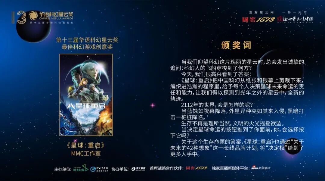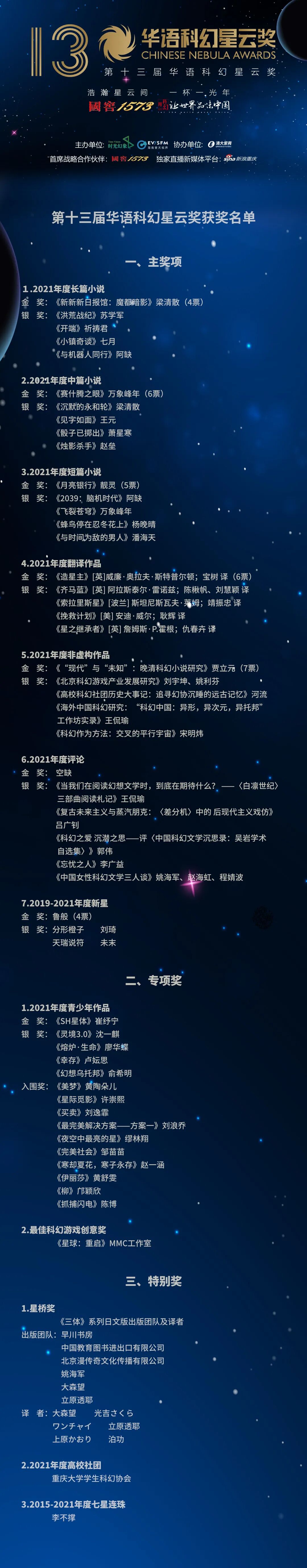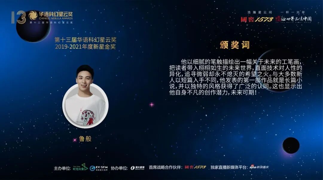 12月10日,第十三届华语科幻星云奖在成都揭晓。作为中国科幻共同体一年一度的盛事,本届华语科幻星云奖由时光幻象文化公司和海南壹天视界公司主办,清大紫育公司协办,首席战略合作伙伴国窖1573提供大力支持,独家直播新媒体平台新浪重庆全程视频直播。
