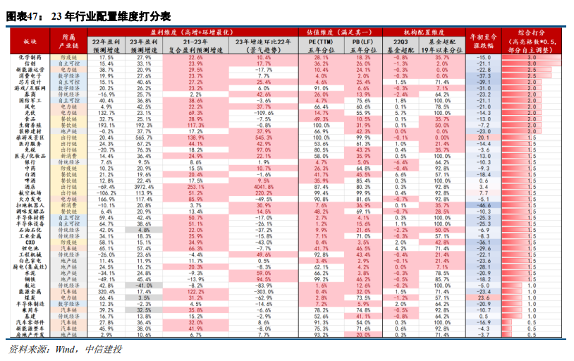 综合以上盈利维度(同时考虑绝对增速+环比增速)、估值维度、机构配置维度及产业周期趋势,23年行业配置打分顺序:医药、计算机、新能源运营、半导体设计、券商、军工、风电、光伏等。