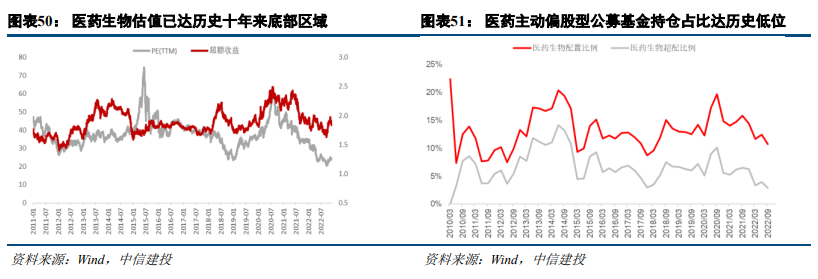 低拥挤度+低估值,板块整体已达高赔率。2021年6月以来受政策压力及板块盈利增速下滑预期影响,申万医药生物指数超额收益持续下行,当前PE(TTM)已低至24倍,处于2010年来10%分位以下;板块拥挤度亦不断消化,22Q3主动偏股型公募基金医药持仓比例为9.9%,较Q2进一步下降0.9pct,目前基金持仓比例低于历史平均。