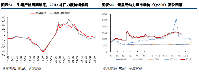养殖:能繁母猪存栏数量变化大致对应10-12个月后生猪供给变化,产能自21年上半年以来开始去化下行,至22年5月前后周期触底,且22H2补栏力度持续较弱,对应22H2-23年猪价高位震荡预期,ROE修复后仍有望维持高位。