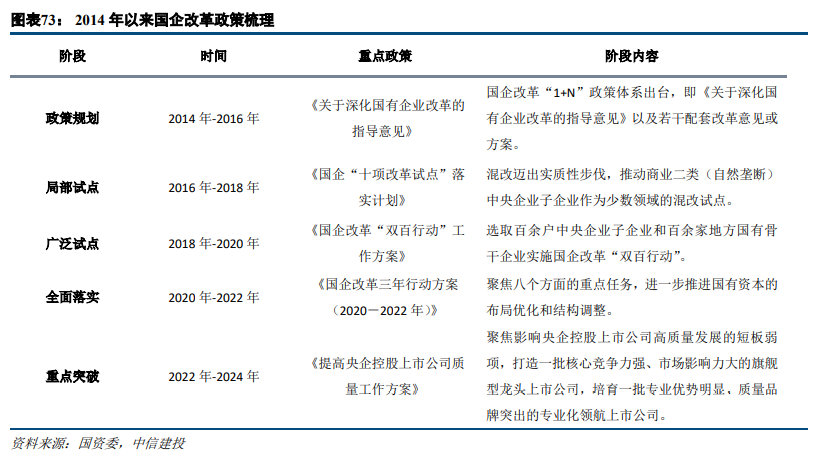 国企改革逐步突破,不断纵深发展。国资委按照先试点后推开原则,分四个阶段先后落地“十项改革试点”、“双百行动”、“三年行动”等改革计划,极大提升了国有企业的经营活力。当前国企改革三年行动进入收官冲刺阶段,截至9月初,各中央企业和各地改革工作台账完成率均超98%。下一阶段,央企控股上市公司高质量发展与战略新兴产业布局将成为改革新重点,国企改革不断纵深发展,国有企业发展动力与可持续性逐步增强。