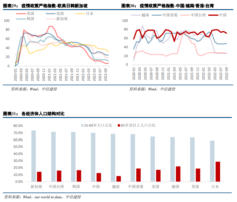 国内放开后消费复苏路径或更类似于亚洲经济体。一方面,从影响居民消费习惯与信心的疫情政策上看,亚洲经济体放松前政策严格程度及放松时间均与国内更相近。放开时间上,越南/中国台湾/中国香港晚于英美/日韩/新加坡;政策严格强度上,21年下半年以来,越南/中国香港强于日本/新加坡,再强于英美。另一方面,从影响消费复苏弹性的人口结构上看,中国中青年群体占比和老龄化比例也与亚洲经济体更相似。2021年15-64岁人口占比数量上,新加坡/中国台湾/韩国 > 中国/越南/中国香港 > 美国/德国/英国/日本;65岁及以上人口占比数量上,日本/德国/中国香港 > 英美韩 >中国台湾/新加坡/中国/越南。