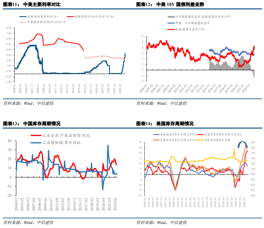 明年美国从“胀”到“滞”是主线。工资-通胀螺旋迹象已缓解,据最新数据,美国职位空缺数自4月来持续下跌,薪酬增长指数自6月来扭头并有所下滑。CPI 同比增速滞后于基础货币增速25个月左右,鉴于美国基础货币增速在20年5月已经见顶并区间震荡,22年6月CPI的高增速9.10%或已是本轮通胀最高点。随着俄乌冲突的缓和,能源食品价格下行,美国通胀拐点已现,同时就业数据进一步下滑,经济进入下行周期。